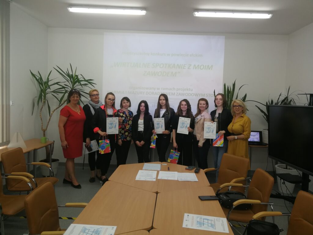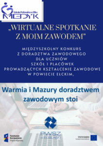 W dniu 13.05.2021 roku, został rozstrzygnięty Międzyszkolny Konkurs z doradztwa zawodowego „WIRTUALNE SPOTKANIE Z MOIM ZAWODEM”, adresowany do uczniów szkół i placówek prowadzących kształcenie zawodowe w powiecie ełckim, zorganizowany w ramach projektu ”Warmia i Mazury doradztwem zawodowym stoi”. Warunkiem wzięcia udziału w konkursie było wykonanie krótkiego filmu wideo prezentującego zawód, w którym uczeń odbywa naukę w danej szkole.