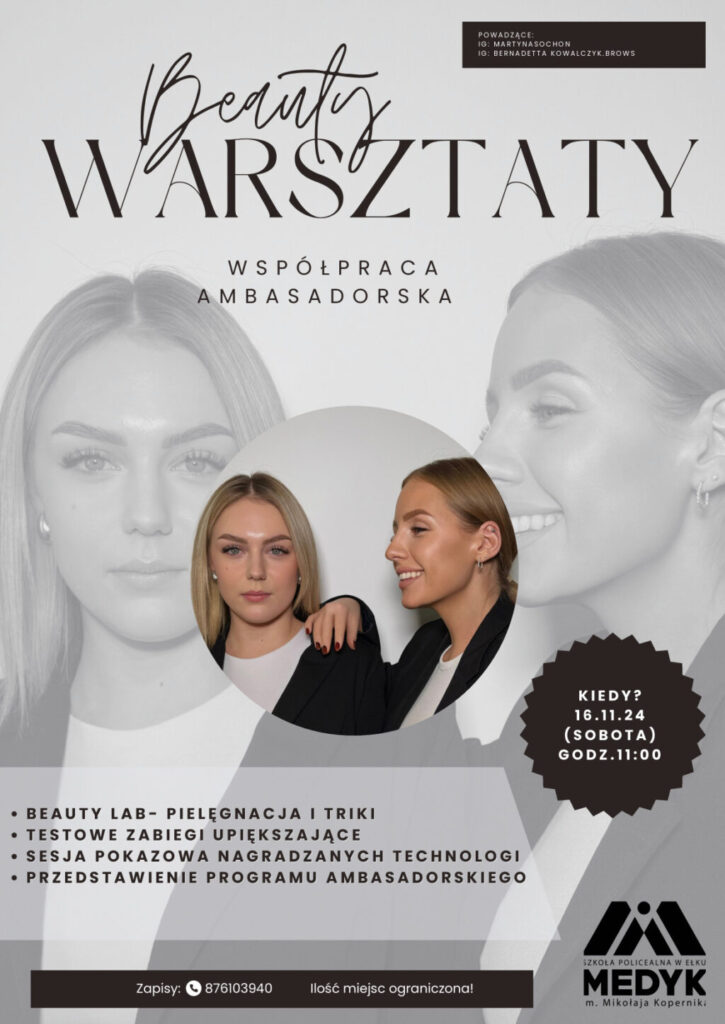 Zapraszamy na warsztaty, które odbędą się w pracowni kosmetycznej Szkoły Policealnej im. Mikołaja Kopernika w Ełku już 16.11.2024 godz 11.00.